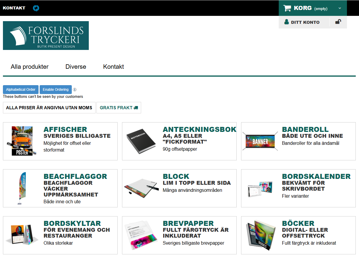 Vi trycker: broschyrer, foldrar, kuvert, visitkort, presentkort, tackkort, spiral-limbunda trycksaker m.m.